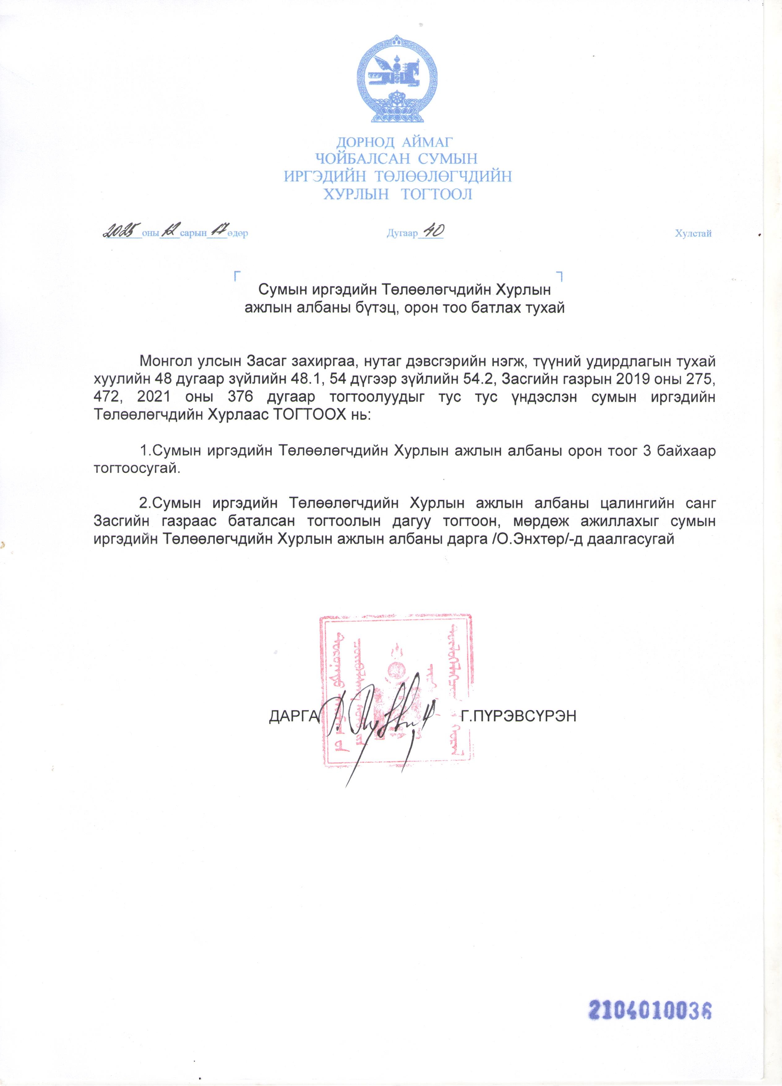 Сумын иргэдийн Төлөөлөгчдийн Хурлын ажлын албаны 2026 оны бүтэц орон тоо батлагдлаа